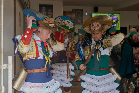 La disfressa està feta totalment a mà. En particular, la jaqueta és curta i està coberta a l'esquena amb un mocador que, en molts casos, és un regal de la xicota. Així mateix, els pantalons són de lli, amb puntes i rivets de cotó. A més, porten camisa i corbata, mitges i lligams elegants de colors cridaners. A la cintura porten dues faixes i per sobre d’elles un cinturó amb sis esquellots que fan un gran soroll quan corren. A la mà duen una samarra: un bastó i símbol d’autoritat amb el qual obren el camí, saluden i castigen.