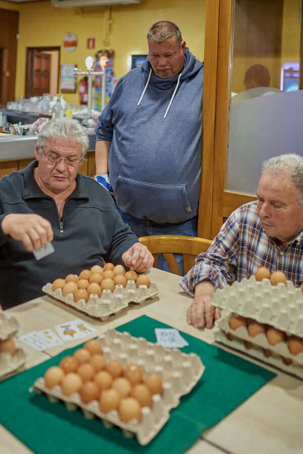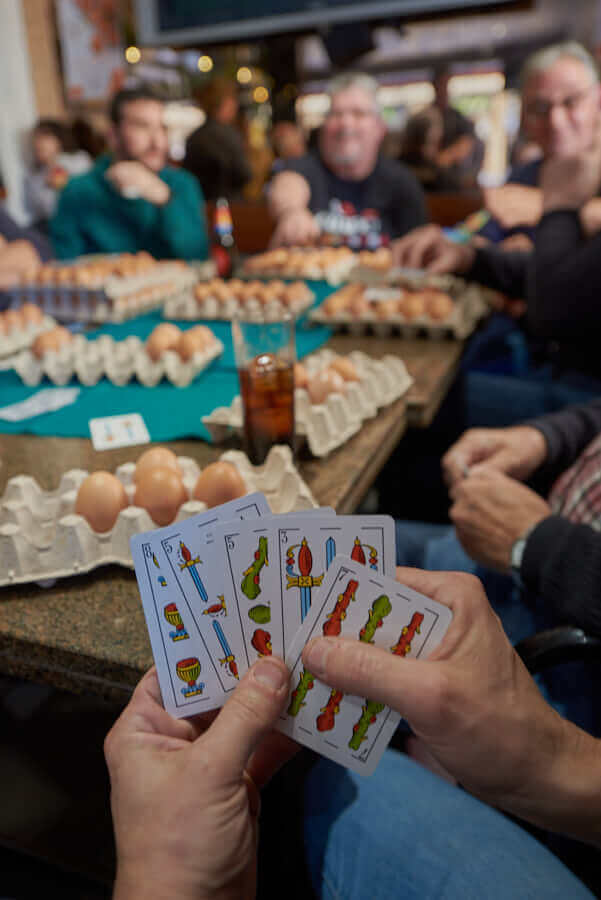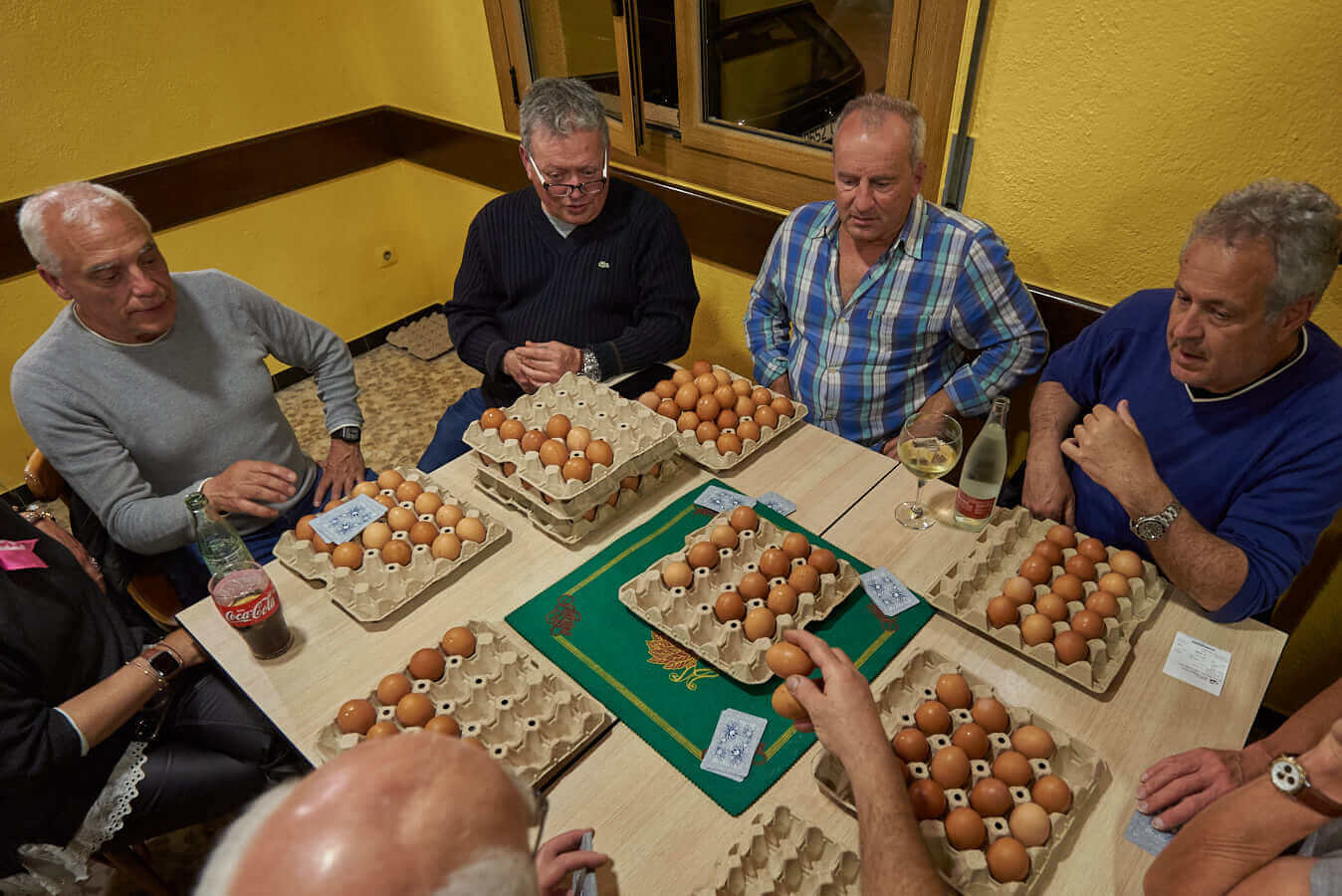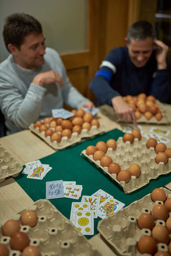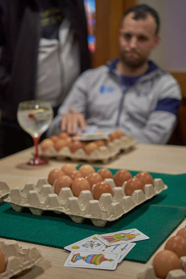 Val a dir que el Joc dels Ous és sobretot una celebració social. Mans que barregen cartes, ous que passen de jugador en jugador i rialles espontànies omplen la sala. A més, l’hostal convida amb brunyols per crear ambient i fer caliu.