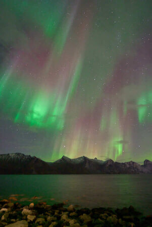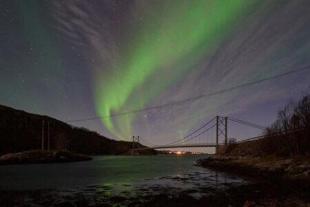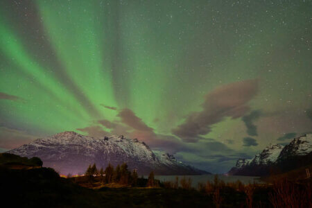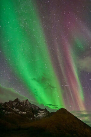 El clima i la latitud de Tromsø i Senja permeten veure-les amb freqüència (sempre amb el permís dels núvols). Els cels s’encenen amb cortines de llum que dansen del verd al violeta. Cada aurora és irrepetible: un diàleg efímer entre partícules solars i atmosfera que converteix la nit en un autèntic espectacle.