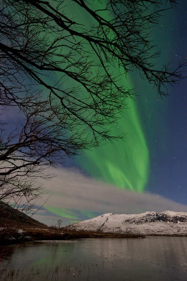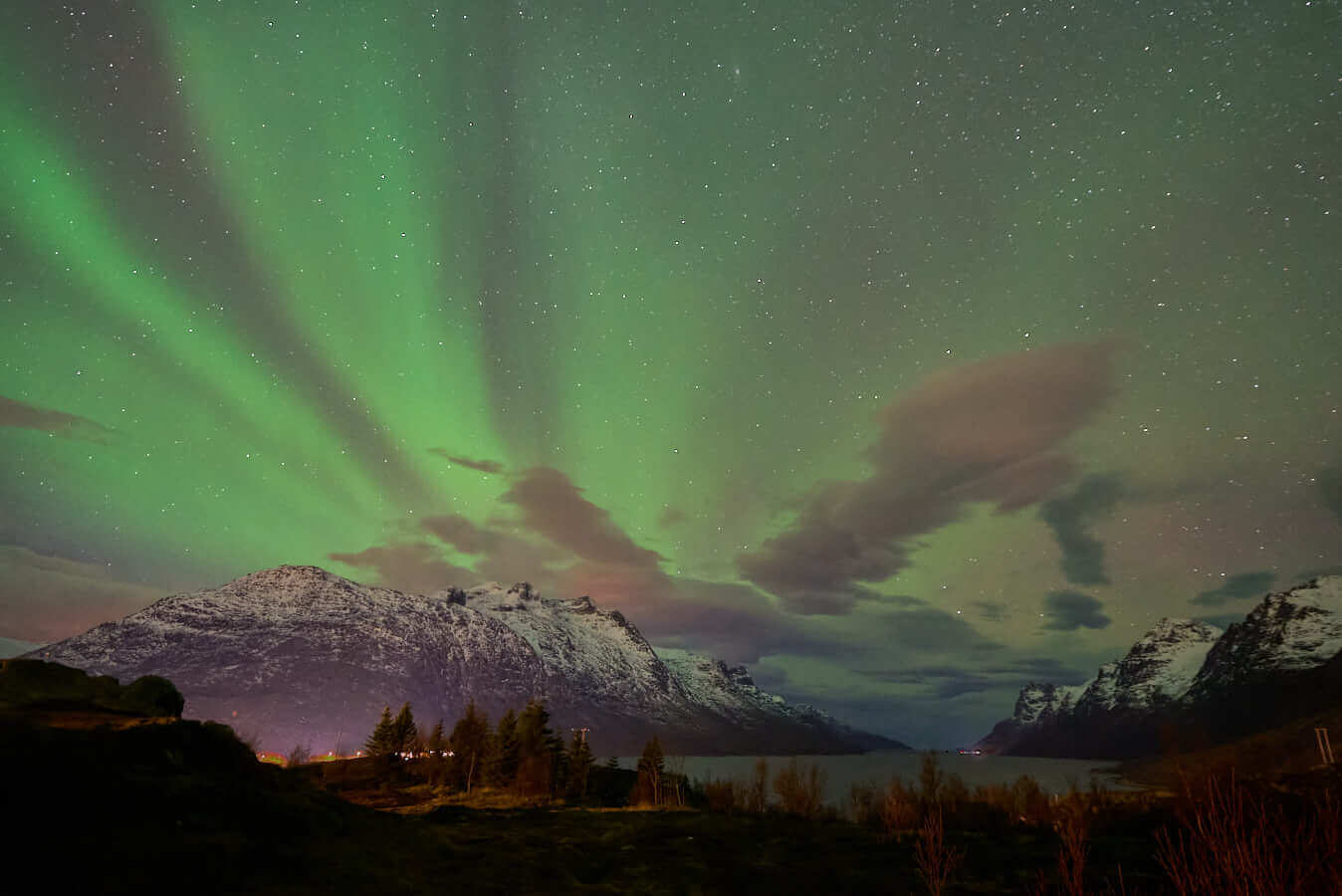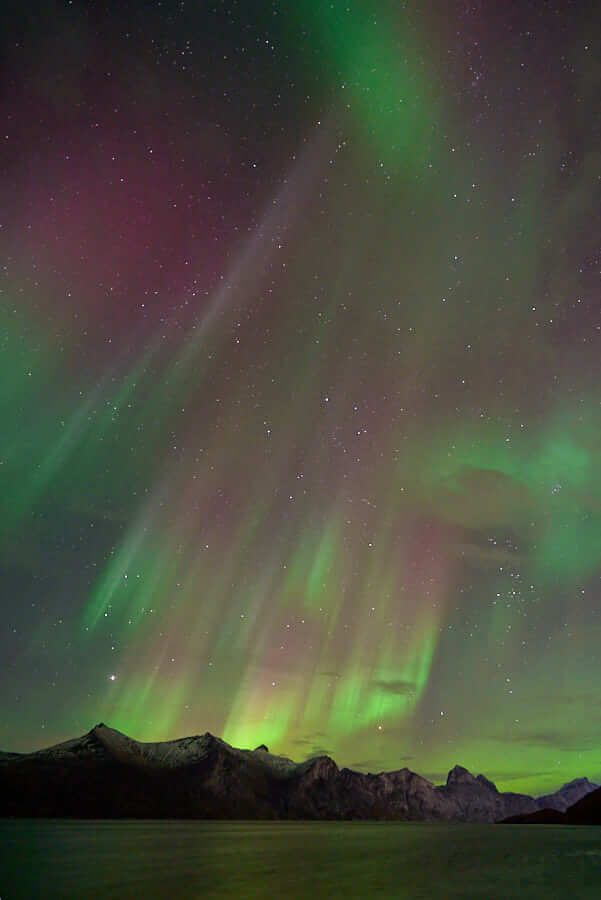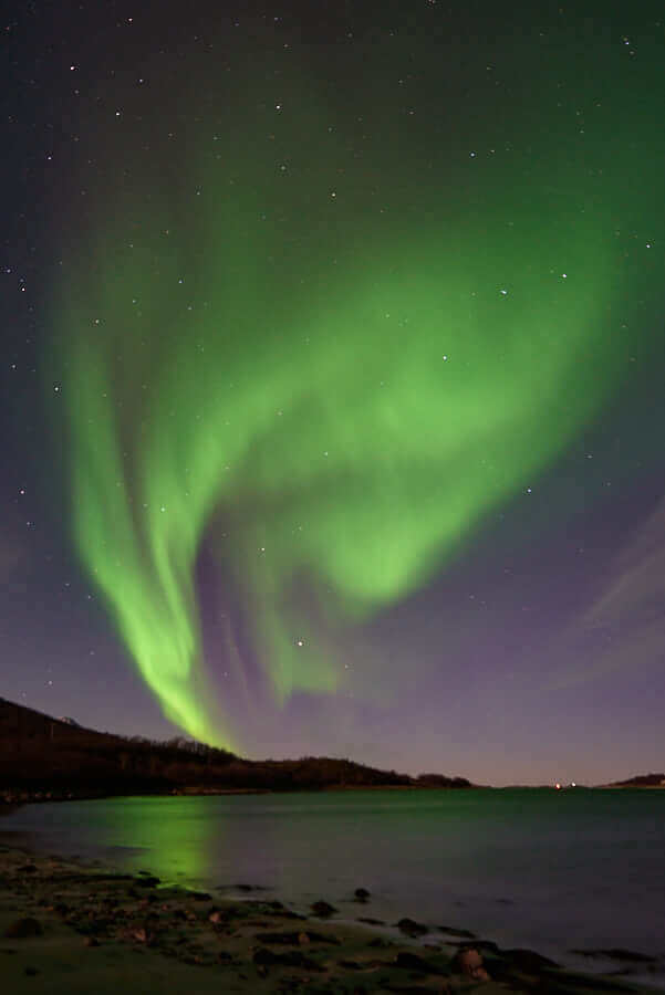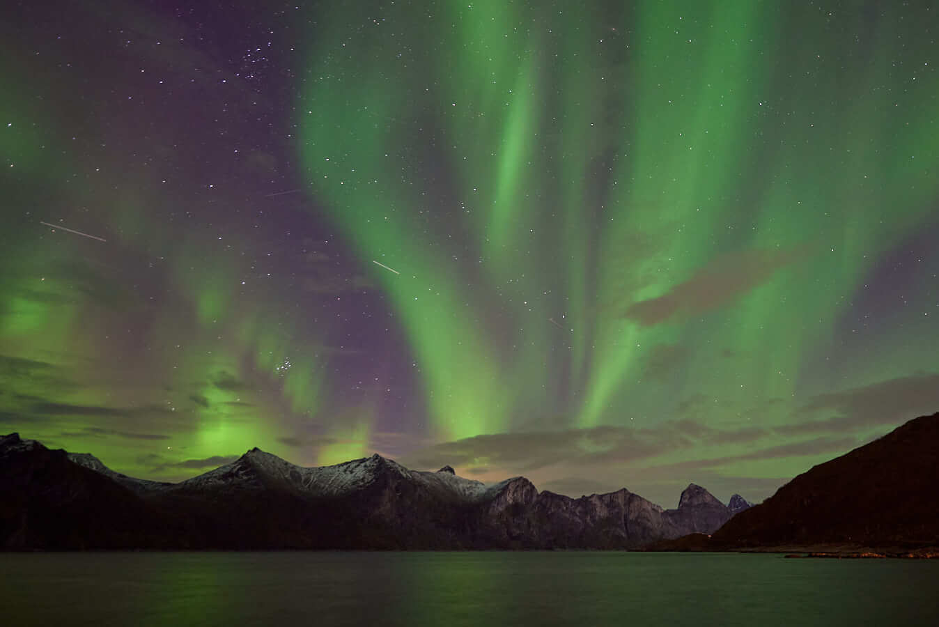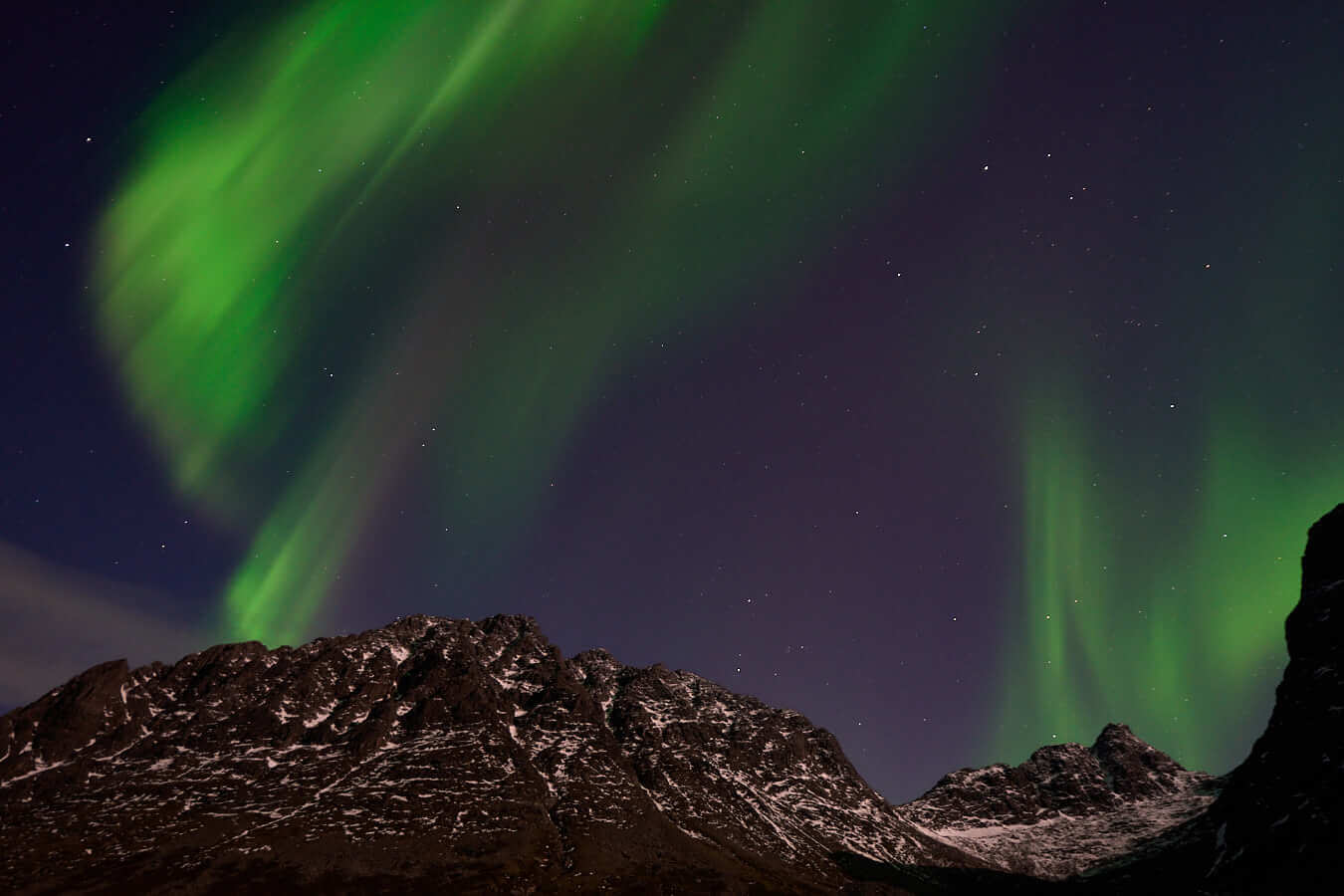 El clima i la latitud de Tromsø i Senja permeten veure-les amb freqüència (sempre amb el permís dels núvols). Els cels s’encenen amb cortines de llum que dansen del verd al violeta. Cada aurora és irrepetible: un diàleg efímer entre partícules solars i atmosfera que converteix la nit en un autèntic espectacle.